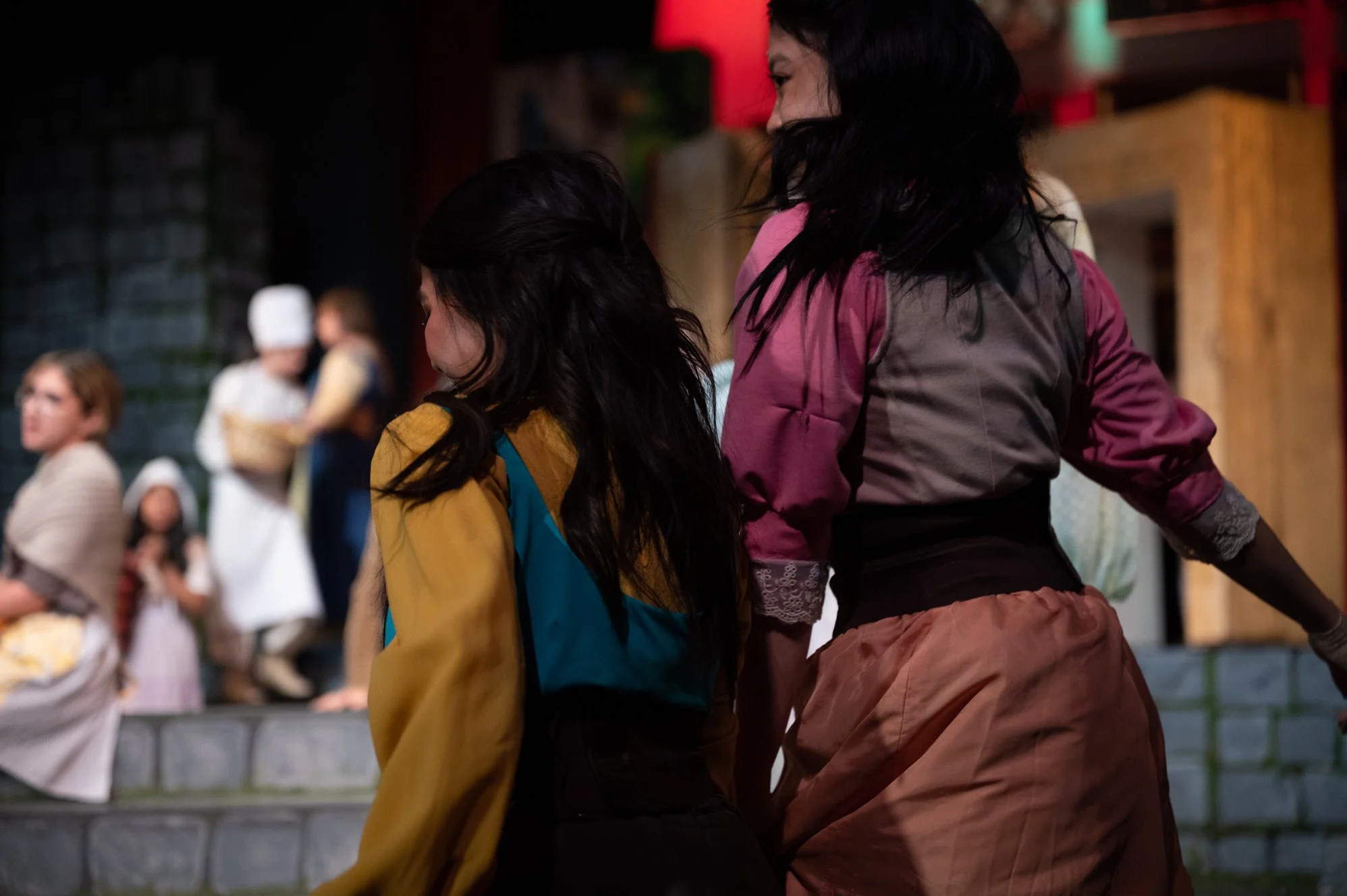For thrusts and “theaters in the round,” or stages where the audience completely surrounds the stage, actors must work in diagonals. The concept of this is instead of standing directly on a front-facing angle, you must position yourself in a way where at least two-thirds of the audience can still see your face. With diagonals, corners are very heavily utilized, meaning that depending on your positioning, you may be in a position where the actors are blocking your shot. Of course, this is at no fault of the actor—from the audience’s perspective, they will be in the best position that they can be. For the photographer, it means that you need to find a better position to shoot from where the corners won’t be an issue.